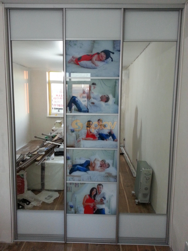 • Фасад шкафа купе: Зеркало серебро, крашенное стекло RAL 9003, фотопечать. Цвет раздвижной системы «Розовое золото».