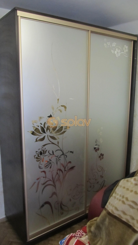 • Фасад шкафа купе: зеркало с пескоструйным рисунком. Цвет раздвижной системы «Розовое золото».