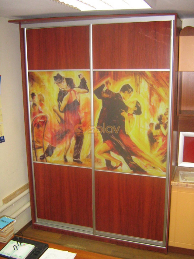 • Фасад шафи купе: Фотодрук, ДСП "Редвуд". Колір розсувної системи «Срібло».
